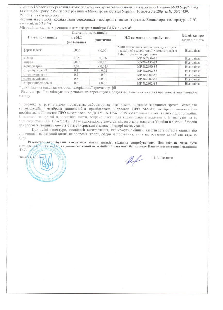 Отчет санитарно-гигиенической оценки шиповидных профилированных мембран Гидростоп ПРО и Гидростоп ПРО МАКС часть 2